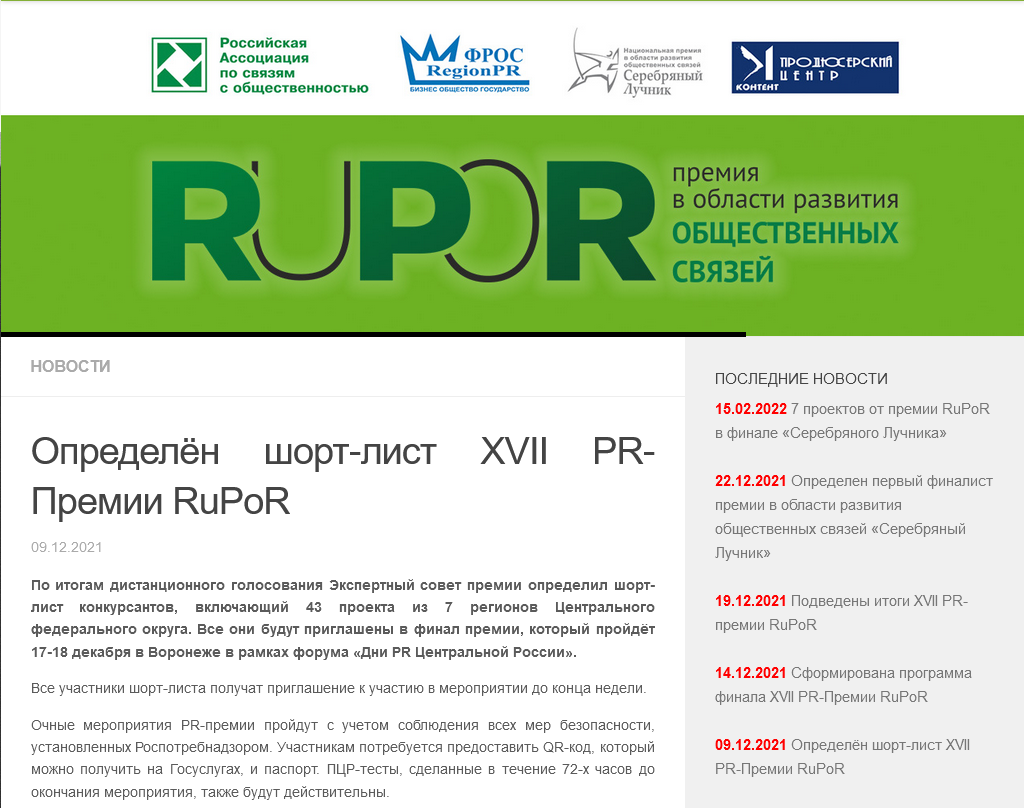 - По итогам дистанционного голосования, 9 декабря 2021 года, Экспертный совет премии определил шорт-лист конкурсантов, включающий 43 проекта из 7 регионов Центрального федерального округа. Все они были приглашены в финал премии, который прошел 17-18 декабря в Воронеже в рамках форума «Дни PR Центральной России».